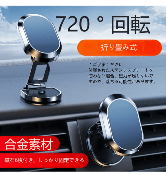 車用スマホホルダー|720度回転可能・磁気吸引式・折り畳み ご注意:本製品はスマホケース、また、スマホの背にシール貼らなければなりません。