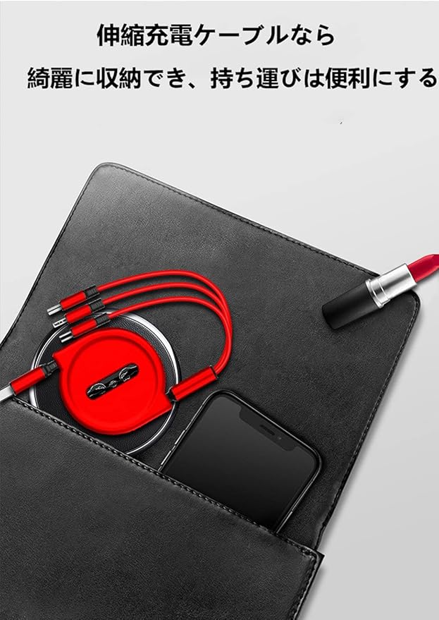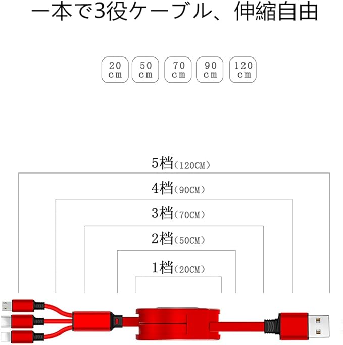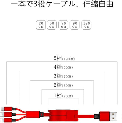 • 【一本3役・3台同時に充電】ライトニング・タイプC・マイクロUSB 巻取り式充電ケーブル。5段階調節、長さ最大約120cmまで延長可能、最小約35cmまで収納可能で、ご使用中、お好きな長さに調節できます。 iPhoneケーブル、Micro-USBケーブル、Type-Cケーブルでほぼ全てのiPhone、Android設備に同時充電できます。