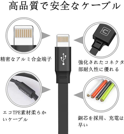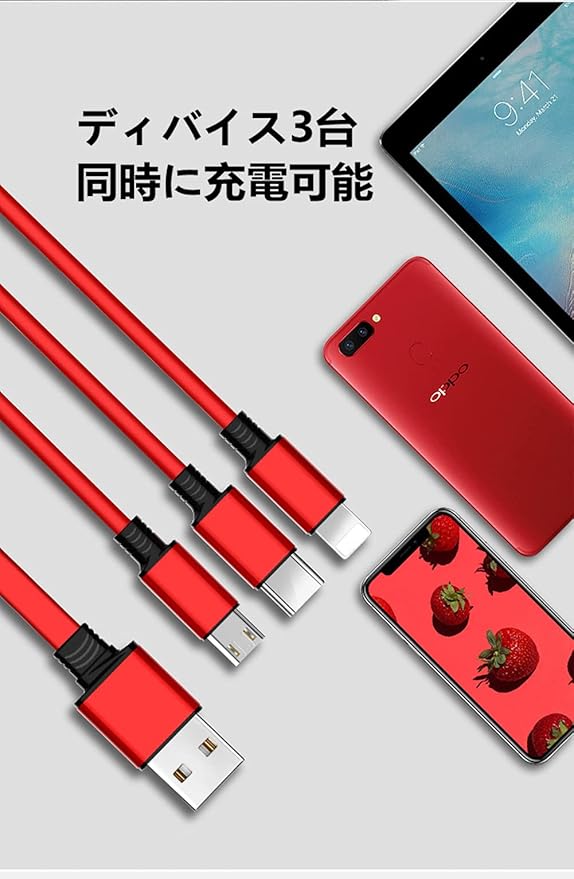 • 【充電・安定転送】ケーブルの内部は高純度線芯を使用、安全性能が高く、良い導電性を持ち、短路の心配はないです。電気抵抗が低く、高効率な充電が保証できます。また、発熱などの問題がなく、長時間に使えます。3つのコネクターが3A大電流で通過可能、充電の急速性と安定性を兼ねて備えて、充電のスピードは35%を加速できます。 ※ライトニング ポート(iOS)がデータ伝送と充電できます。Microポート(Android) とType-Cポートが充電用ケーブルなので、充電のみ対応で、データ通信機能がありません。予めご了承願います。