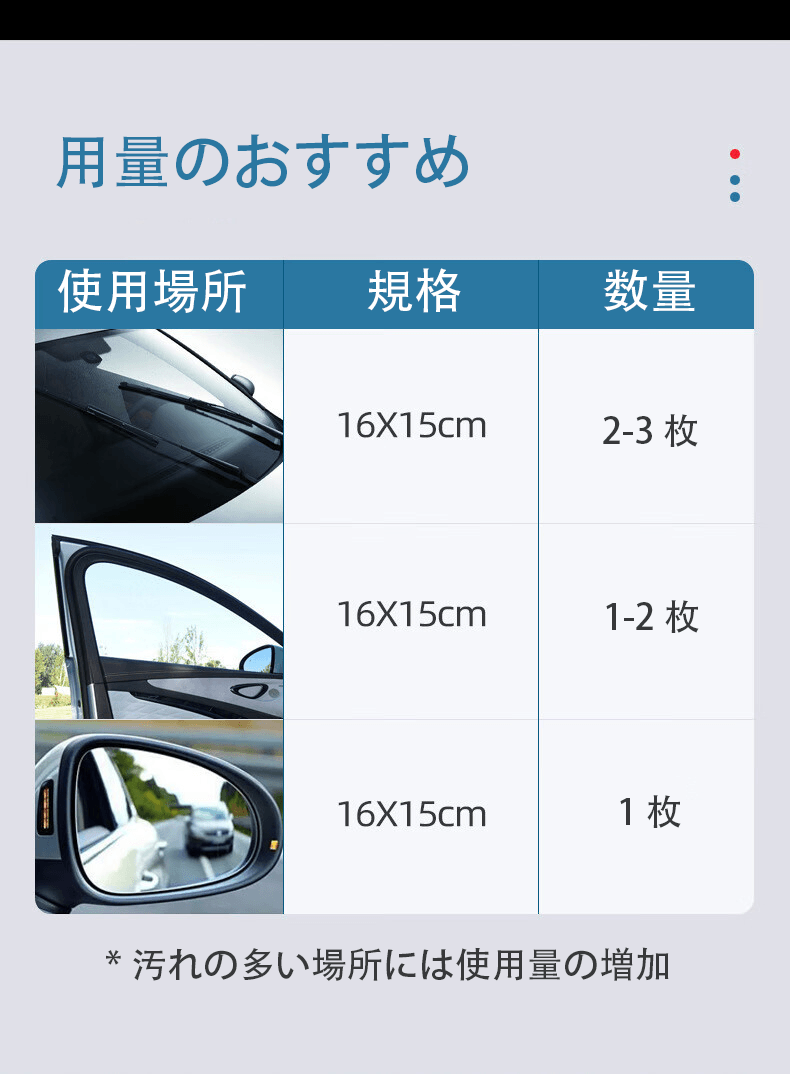 製品の特長: ガラスの上の虫ゴム、油汚れ、ほこりなどを一度に一枚ずつ捨てることで、時間と労力を節約できます。