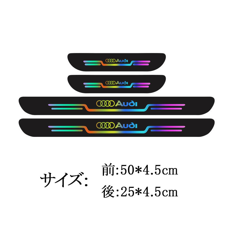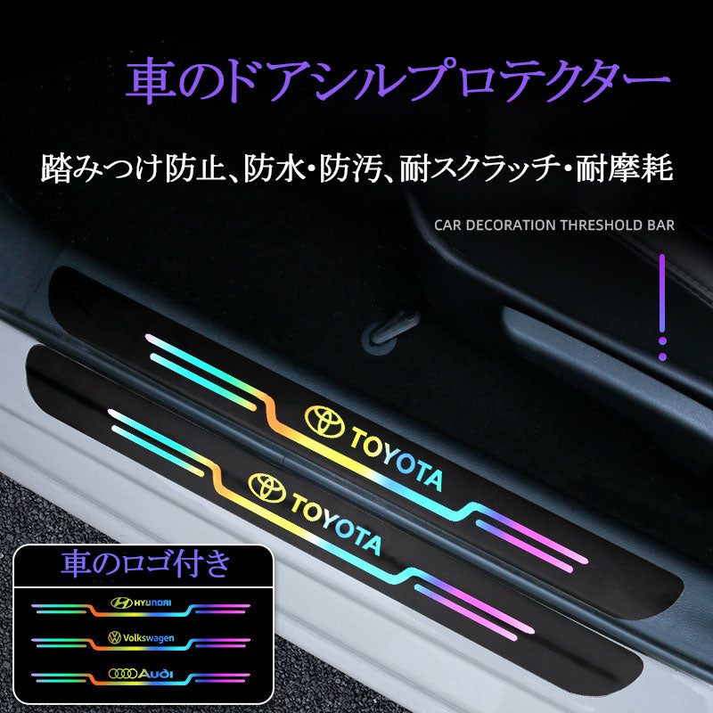 車のドアシルプロテクター、4枚入り。車のロゴ付き、ステップガード、傷防止、フットペダル保護ステッカー、ドアステップデコレーション、耐擦傷ストリップ