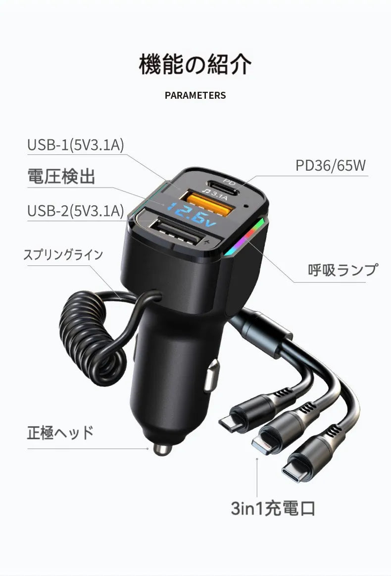 3in1 高速充電のシガーライター充電器|TPYE-USB ダブルポート、24V/12V 対応